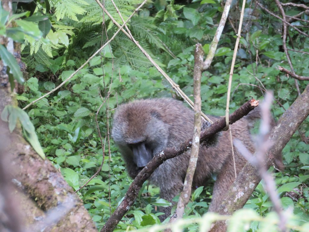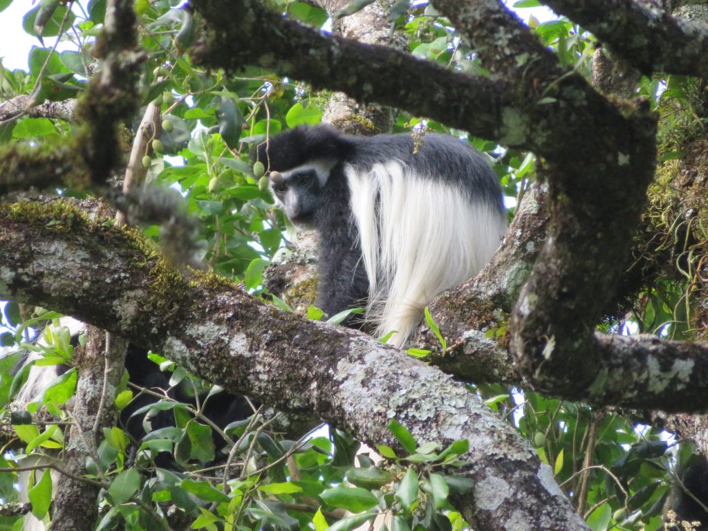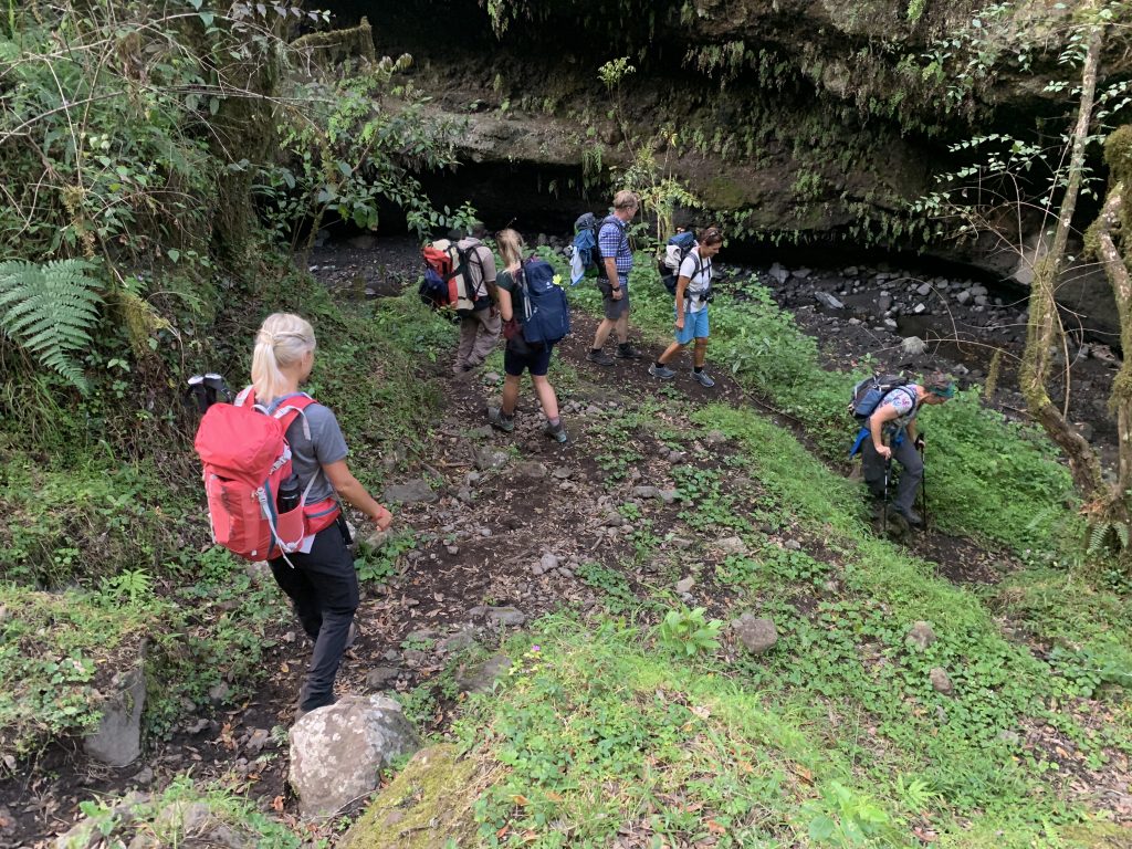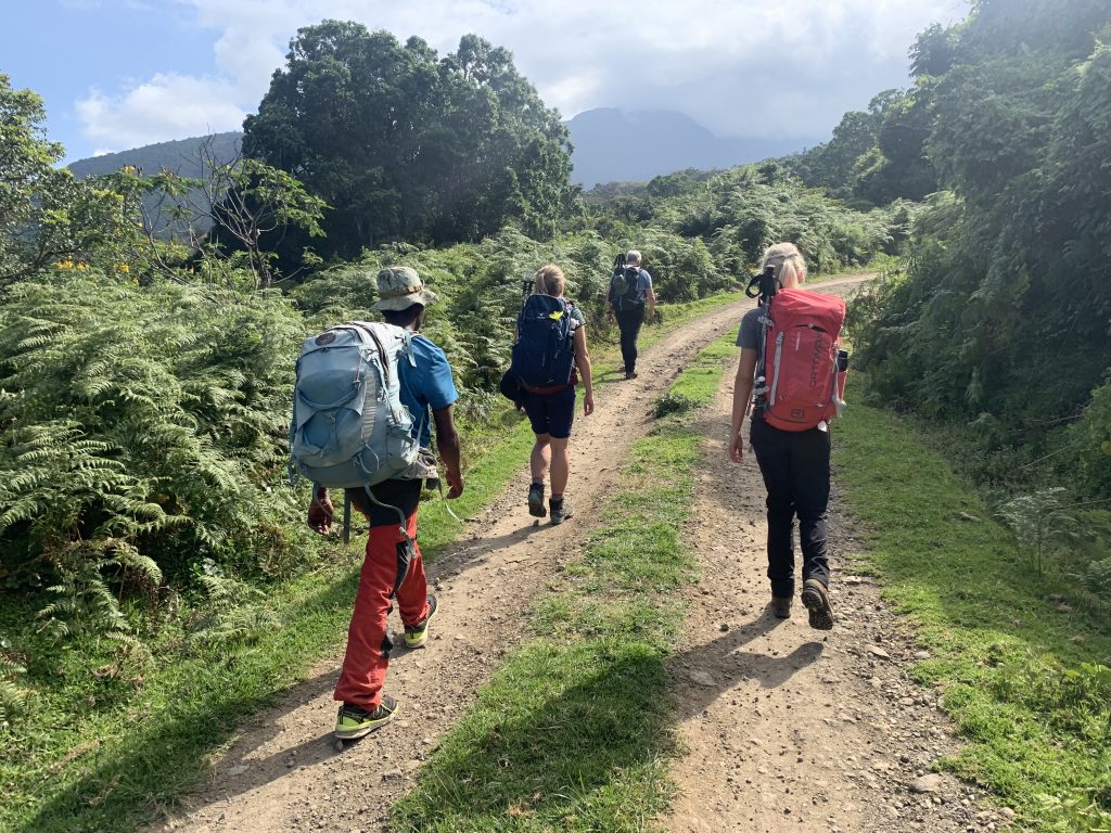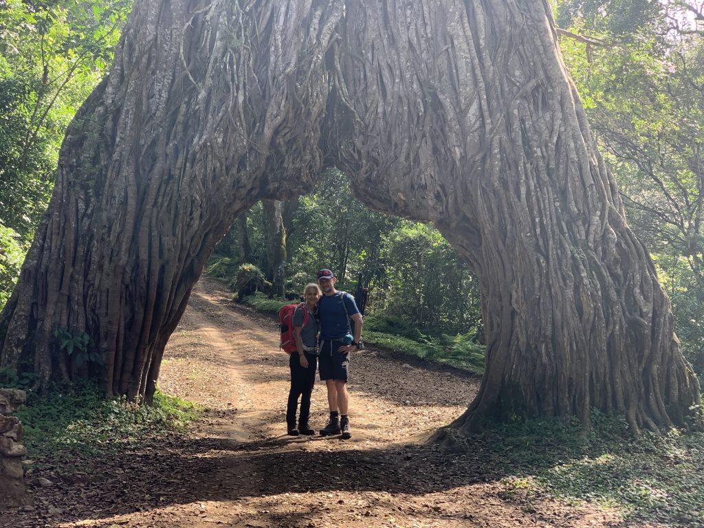 Und so begann es also, unser Bergabenteuer in Tansania. Der Weg auf den Mount Meru führt zunächst etwas unspektakulär über einen Forstweg, der jedoch mit der Zeit immer schmaler wird. Auch die Bewaldung nimmt mit der Zeit zu und schon befindet man sich mitten im afrikanischen Regenwald. Hält man die Augen offen und achtet man auf die Hinweise der Guides und Ranger, kann man auch immer wieder Affen in den Bäumen entdecken. Je nachdem, auf welcher Route man den Berg hinauf geht, kommt man bereits jetzt am sogenannten „Fig Tree Arch“ vorbei. Dabei handelt es sich um einen Feigenbaum, durch den ein tunnelartiger Durchgang führt. Allerdings muss man wohl die Frage stellen, was zuerst da war – der Tunnel durch den Baum oder doch eher der durch ihn hindurch führende Weg…