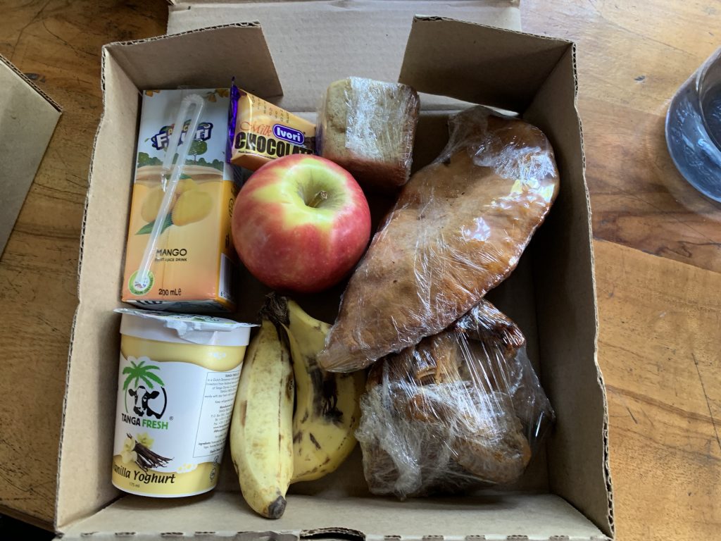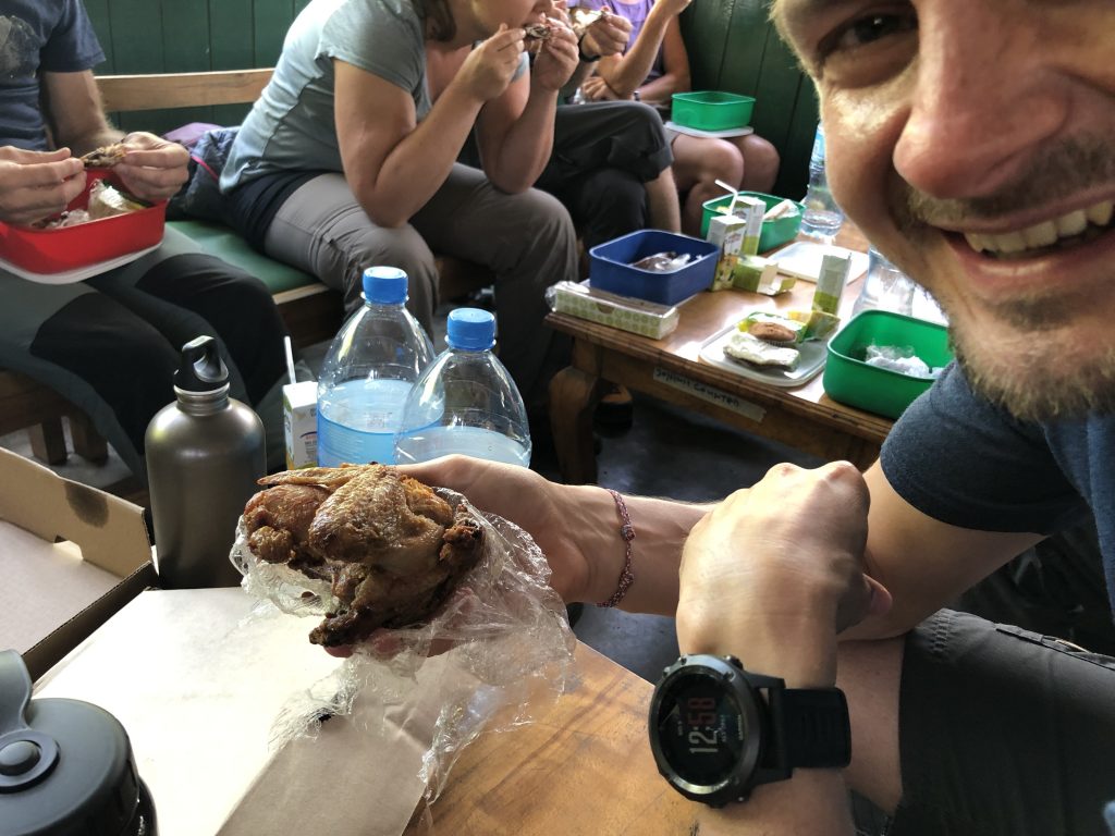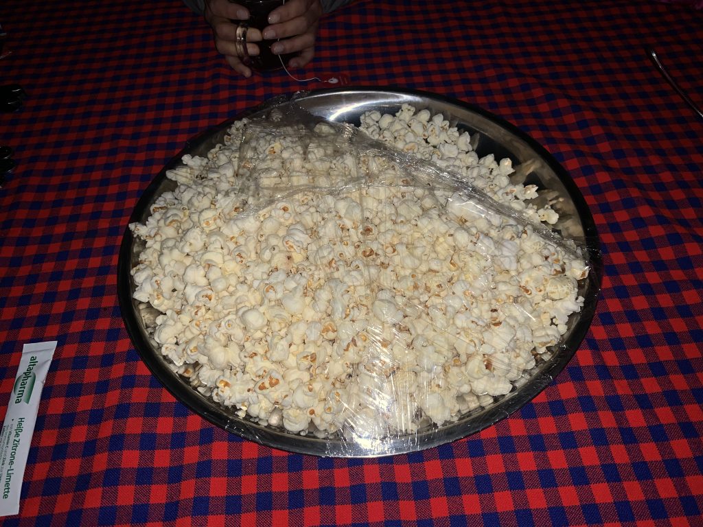In der großen Gemeinschaftshütte wartete bereits eine Tradition auf uns, die uns auch in den kommenden Tagen begleiten würde: Es gibt erstmal einen großen Teller salziges Popcorn, um den ersten Hunger zu stillen, bis es das „richtige“ Abendessen geben würde. Dieses präsentierte sich letztlich als wahres Festmahl. Es ist schon extrem beeindruckend, was die Begleitmannschaft einem sowohl hier als auch später am Kili an Essen auf den Tisch zaubert! Nudeln, Gemüse, Suppe, Hühnchen, Rind, Obst, Reis… Es ist wirklich alles dabei, was das Herz begehrt! Allerdings ist auch diese Auswahl stark abhängig vom gebuchten Anbieter. Während wir uns an unserem stets mit einer rot-blau karierten Tischdecke versehenem Tisch über unser Drei-Gänge-Menü hermachten, gab es am Nachbartisch das Kontrastprogramm. Die dort sitzende Gruppe aus Belgien bekam nämlich lediglich einen Schwung Tütenessen auf den Tisch geworfen und jeder durfte sich eines aussuchen. Die neideischen Blicke waren uns gewiss.