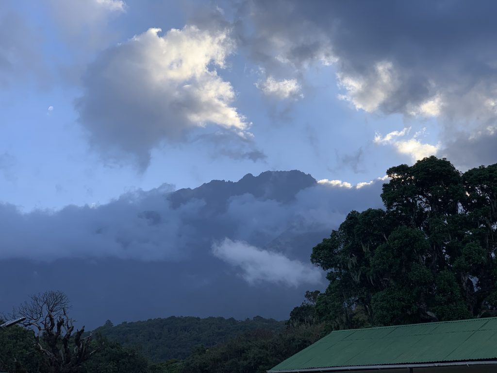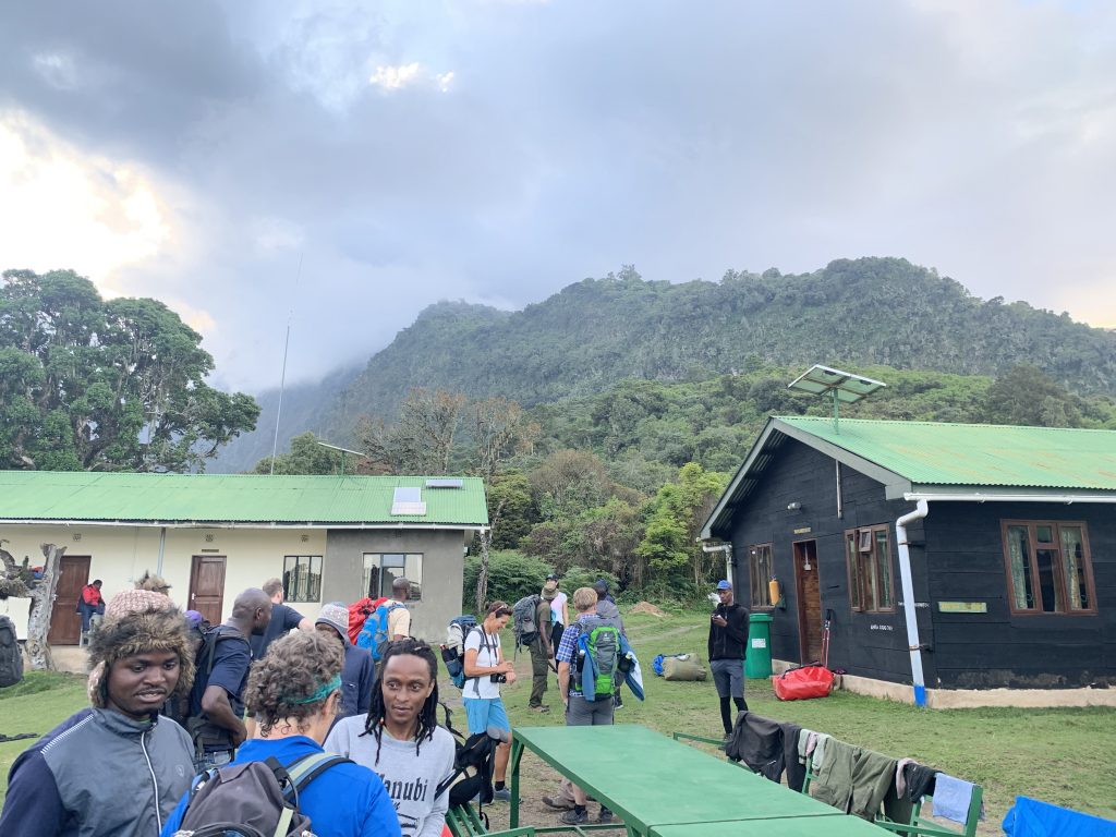 Nach einiger Zeit des Aufstiegs erreichten wir schließlich eine Lichtung, auf der wir eine kleine Rast einlegten und von der aus man einen fantastischen Blick auf die umliegende Landschaft hat. Da unten liegt also Afrika… Etwas, was man sich bei einer solch exotischen Reise durchaus immer mal wieder in Erinnerung rufen sollte. Und auch in die andere Richtung lohnt der Blick. Hier kann man nämlich bereits das erste große Ziel erspähen: Den zackigen Gipfel des Mount Meru. Von der Lichtung aus ist es nun auch nicht mehr weit bis zur ersten Unterkunft auf dem Weg dorthin: Die Miriakamba Hut auf immerhin bereits 2.500 Metern über dem Meeresspiegel. Die hier aufgebauten Hütten sind natürlich sehr einfach gehalten aber die Betten hätten auch durchaus unbequemer sein können. Zumindest hat man ein festes Dach über dem Kopf und es gibt sogar fließendes Wasser und „richtige“ Toiletten. Dinge, die wir spätestens am Kili schmerzlich vermissen werden.