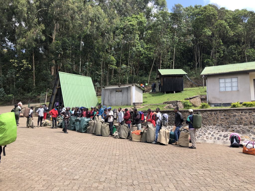 Wie auch schon am Meru, galt es natürlich auch hier zunächst noch diverse Formalitäten zu erfüllen. Während dies von Peter übernommen wurde, warteten wir mit einem Lunchpaket in der Touristenauffangstation und beobachteten die Affen in den umliegenden Bäumen. Zusätzlich zu unserer Rumpfmannschaft werden zu diesem Zeitpunkt auch in der Regel noch weitere Träger, sogenannte Porter angeheuert, die ebenfalls mit uns auf die Tour gehen sollten. Als all dies erledigt und auch unsere Ausrüstung gewogen war, ging es tatsächlich los. Der Marsch auf den höchsten Berg Afrikas begann.