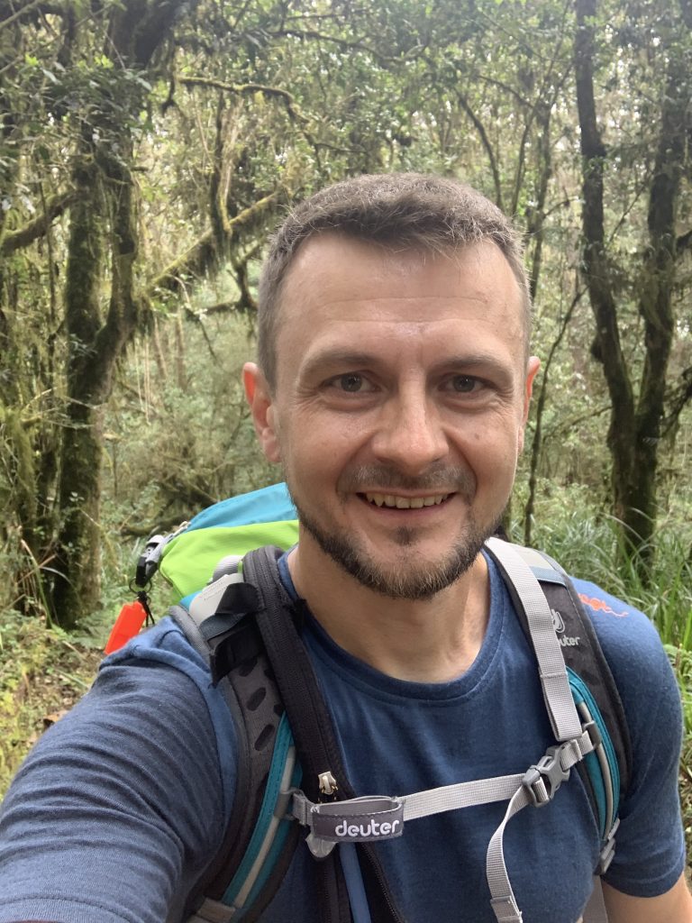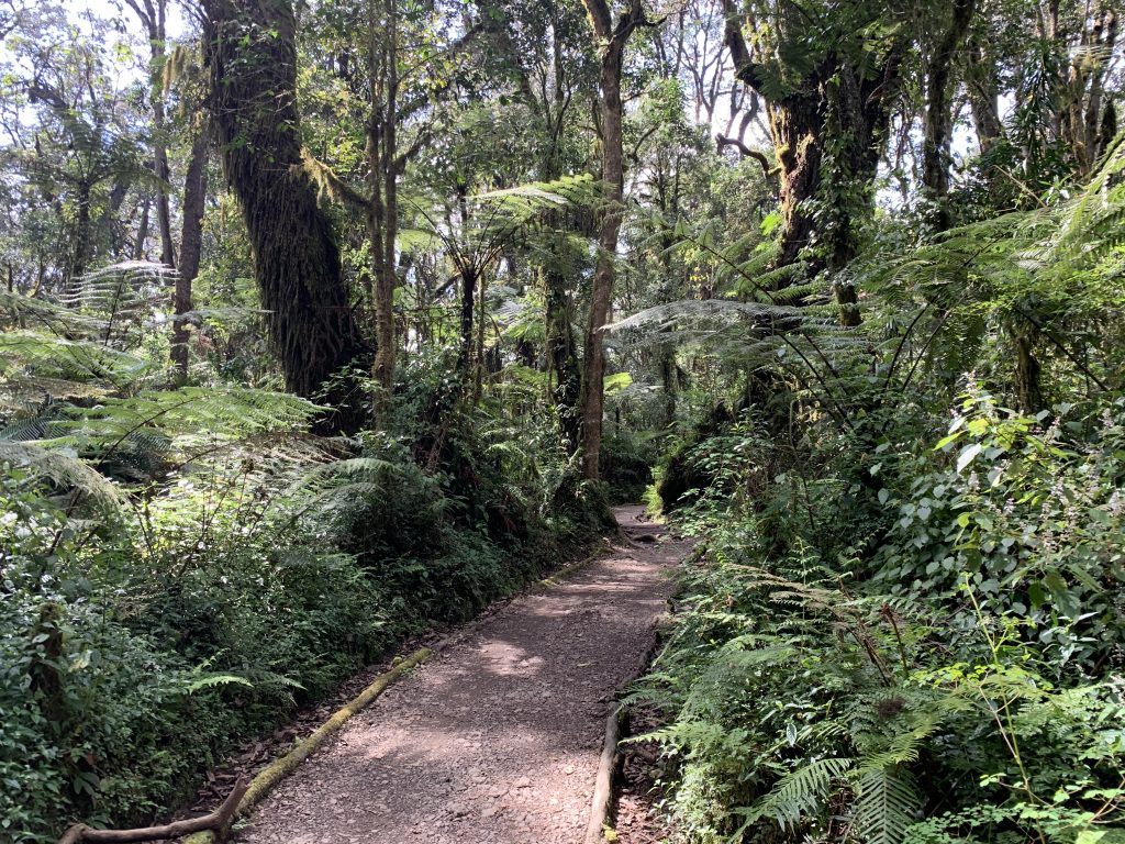 Die erste Etappe führt dabei vom Machame Gate zum Machame Camp und man bekommt so langsam eine Idee, warum unsere Route Machame-Route heißt. Der Weg führt zunächst durch den afrikanischen Regenwald und erinnert eher an eine Forststraße als an einen kraxeligen Wanderweg. Dies änderte sich jedoch nach und nach und der Wald wurde dichter und der Weg schmaler. Am Rand konnten wir immer wieder exotische Pflanzen bewundern. Petrus hatte es verdammt gut mit uns gemeint, denn erneut konnten wir bei blauem Himmel losmarschieren. Dieser wurde zwar mit der Zeit etwas bedeckter aber es blieb durchgehend trocken. Unterwegs begegneten wir immer mal wieder unserem Koch Thomas, der aus seinem Handy für musikalische Unterhaltung sorgte. „DJ Bamboo“ werde ich wohl mein Leben lang nicht mehr vergessen. 😉 Und so stiegen wir immer weiter nicht allzu steil den Berg hinauf und man musste sich immer mal wieder ins Gedächtnis rufen, dass man bereits jetzt am Kilimajaro war. Irgendwie unwirklich.