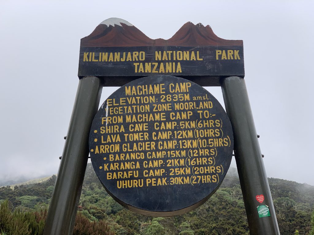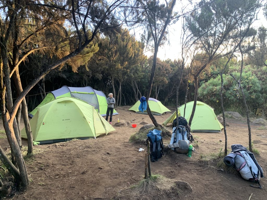 Schließlich erreichten wir das Camp, was uns mit einem großen Holzschild verkündet wurde. Das Machame Camp ist ein großes und weitläufiges Camp. Da es hier noch jede Menge Bäume gibt, existieren auch überall kleinere Nischen, in denen die verschiedenen Anbieter die Zelte ihrer Kunden aufbauten. Auch wir bekamen eine solche Nische und unsere Begleitmannschaft hatte schon sämtliche Zelte aufgebaut und unsere Taschen darin deponiert. Wir hatten von unserem Anbieter sogar ein Toilettenzelt gestellt bekommen, was ein wahrer Segen ist. Zwar ist auch das darin befindliche Chemieklo nicht die angenehmste Sache aber im Vergleich zu den Plumpsklos, die es in jedem Camp gibt immer noch ein großer Komfort.