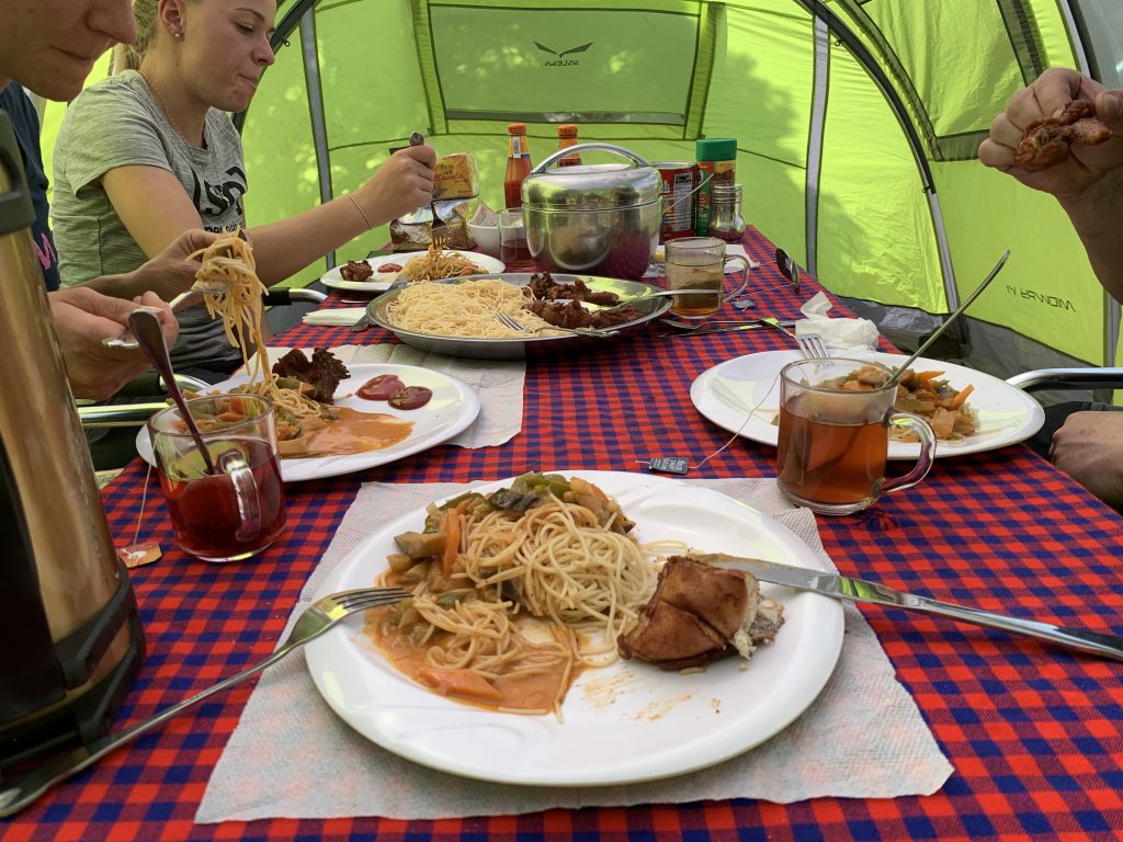 Wirklich beeindruckend ist, was einem die Begleitmannschaft, zu der immer auch ein Koch und ein Kellner gehören, zum Frühstück und zum Abendessen auf den Tisch zaubern. Während es zum Frühstück in der Regel Porridge, Omelette und Obst gibt, steht abends stets ein Drei-Gänge-Menü auf dem Programm. Eingeläutet wird dieses meist von der berühmten Kili-Suppe, die zwar jeden Abend gleich aussah aber irgendwie immer anders schmeckte und uns von unserem Kellner Inno auch immer anders angekündigt wurde. Nicht falsch verstehen, die Suppe war immer lecker! Als Hauptgang kam dann jeden Abend etwas anderes auf dem Tisch. Von Nudeln und Reis über Gemüse bis hin zu Hühnchen und Rind war alles dabei. Wahnsinn! Und immer wirklich lecker! Als Dessert gab es dann jeweils Obst: Melone, Banane, Äpfel. Am Kili muss wirklich niemand hungern, was ein wenig zynisch klingt wenn man bedenkt, dass man sich in Afrika befindet. Umso schlechter war unser Gewissen, als wir irgendwann pappsatt waren aber immer noch jede Menge Essen übrig war. Wir sind aber mal davon ausgegangen, dass sich die Begleitmannschaft durchaus gefreut hat, wenn sie auch noch an unserem Mahl teilhaben durfte.