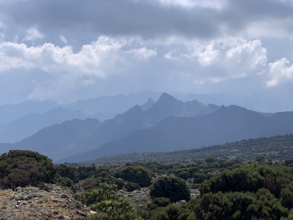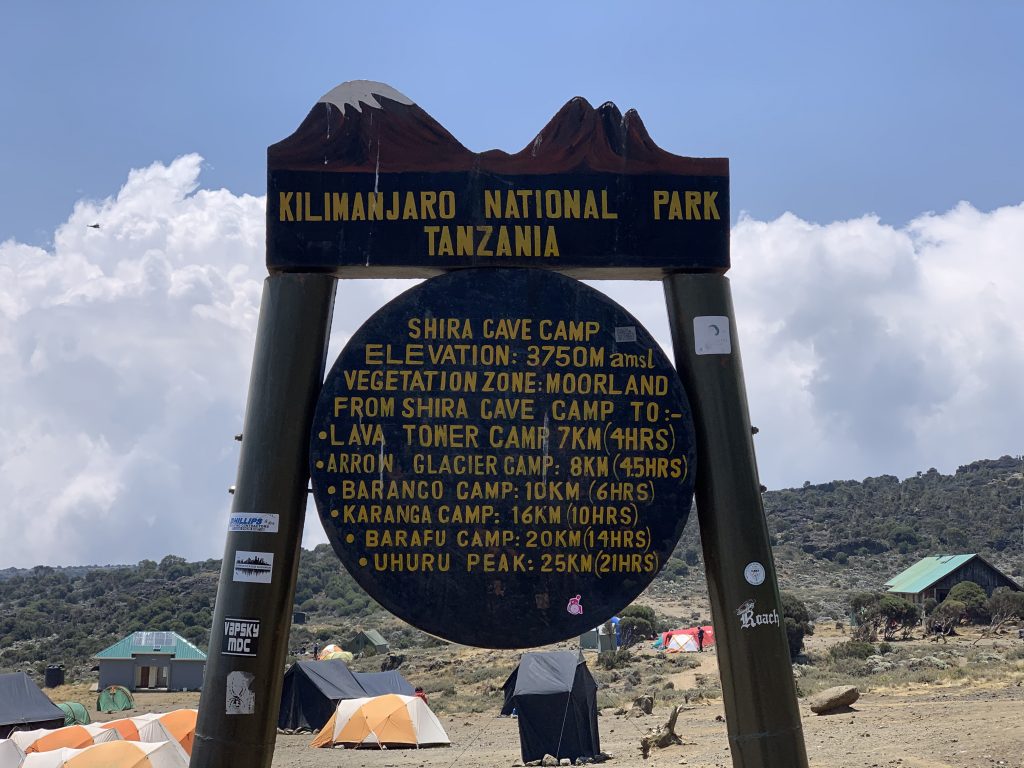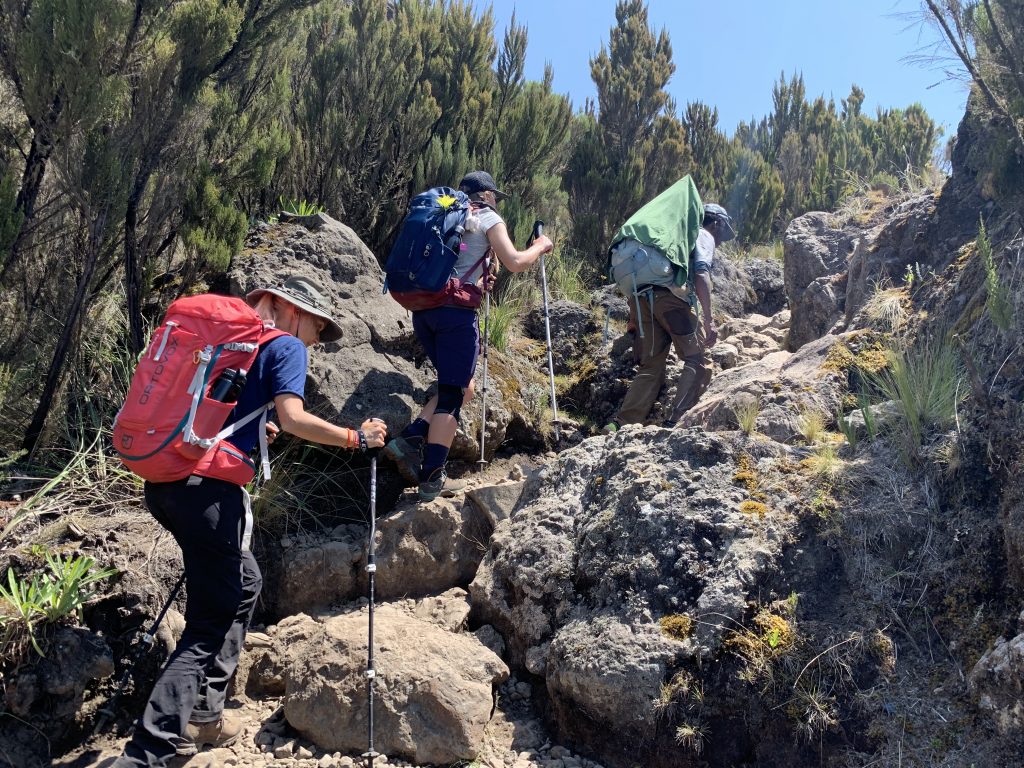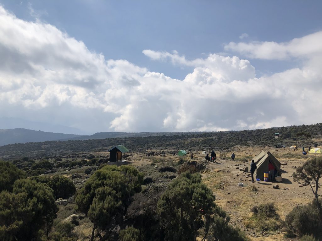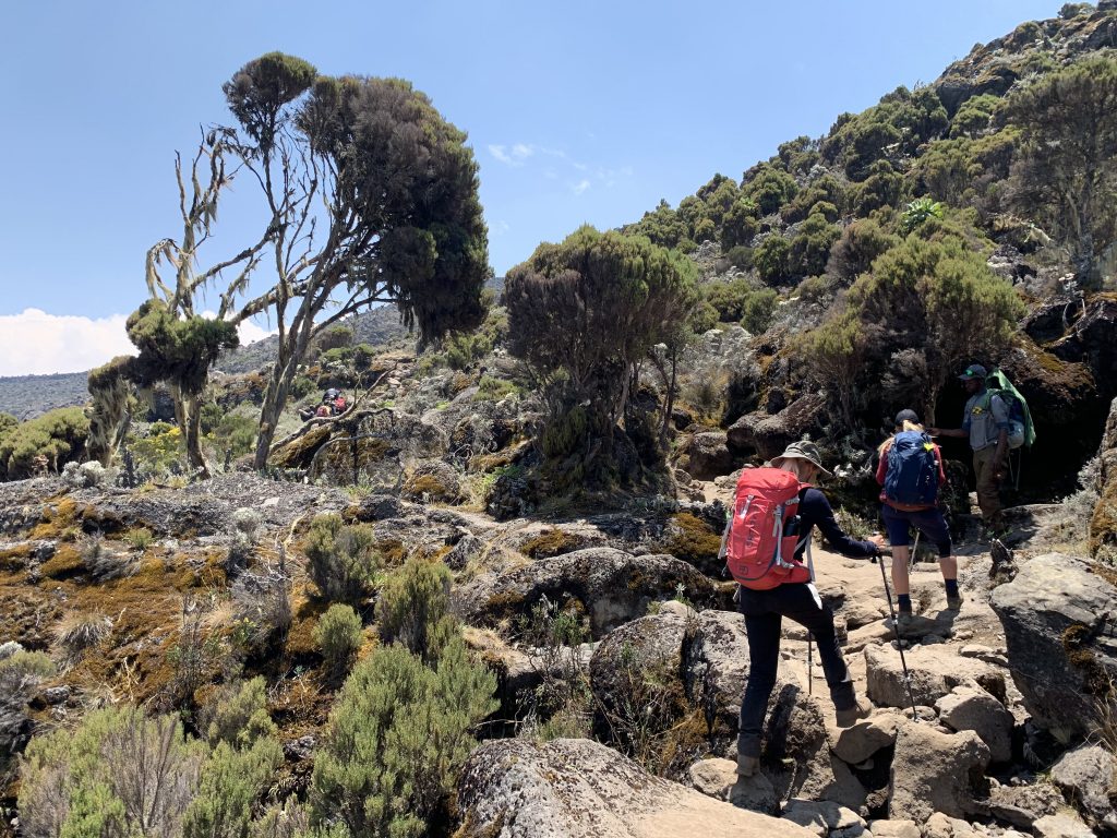 Die Nächte im Zelt am Kili waren allesamt überraschend gut und trugen somit zur Erholung von den Wanderungen tagsüber bei. Auch am zweiten Tag begrüßte uns ein blauer Himmel über Tansania und wir starteten nach einem leckeren Frühstück in die zweite Etappe, die uns vom Machame Camp zum Shira Cave Camp führen sollte. Damit einher ging auch ein erster wirklicher Wechsel der Klimazonen aus der Regenwaldzone in die Heide- und Moorlandzone. Diese zeichnete sich unter anderem dadurch aus, dass die Bäume kleiner und weniger wurden. Auch der Weg erinnerte nun immer weniger an einen Forstweg und mehr an einen „richtigen“ Wanderweg.