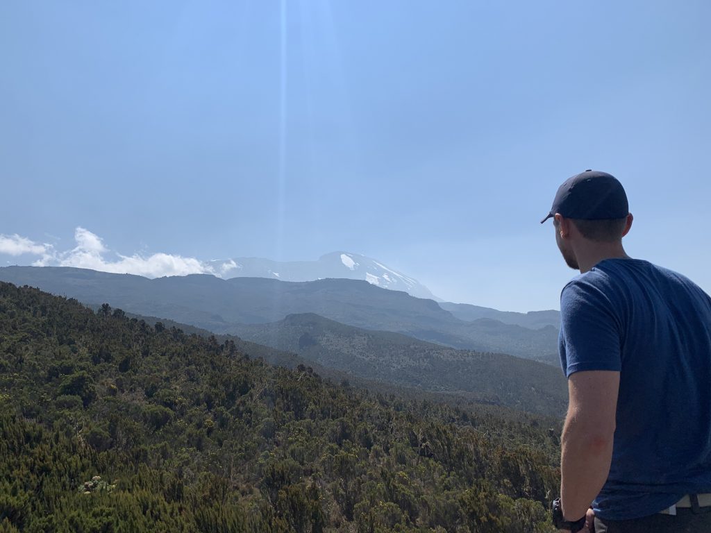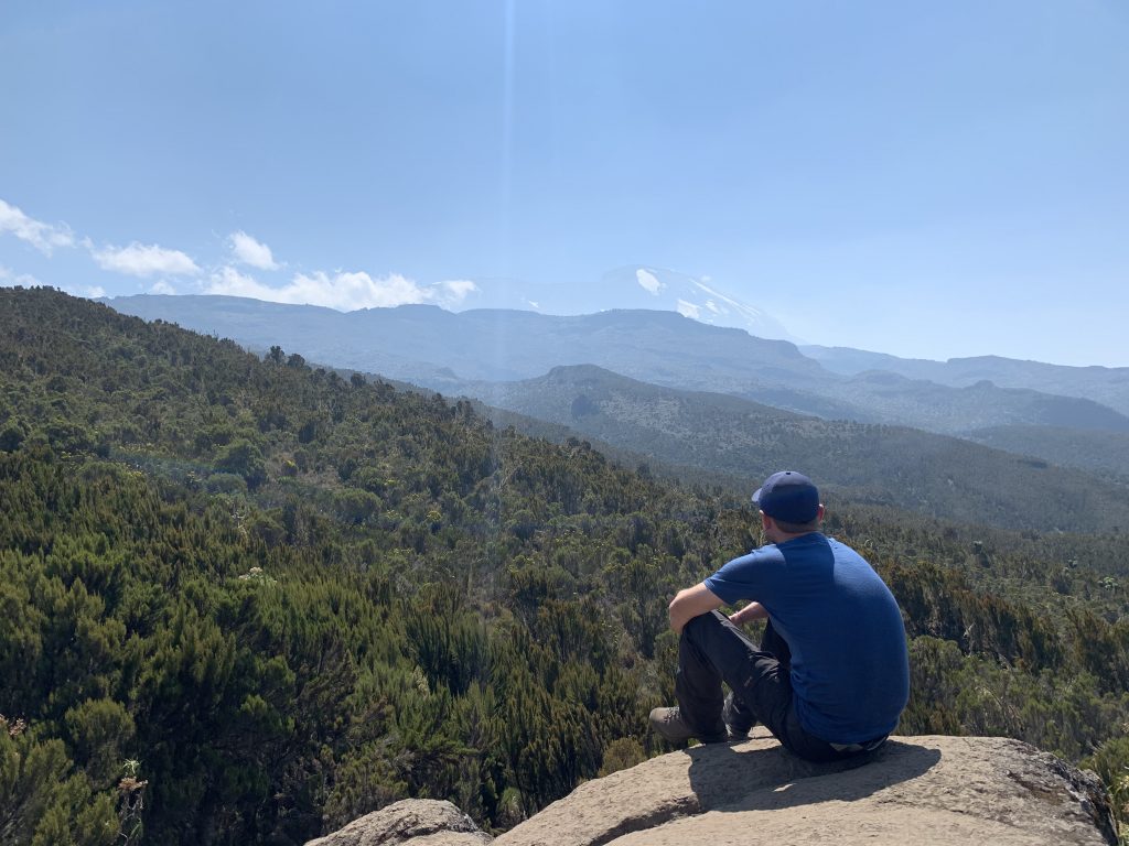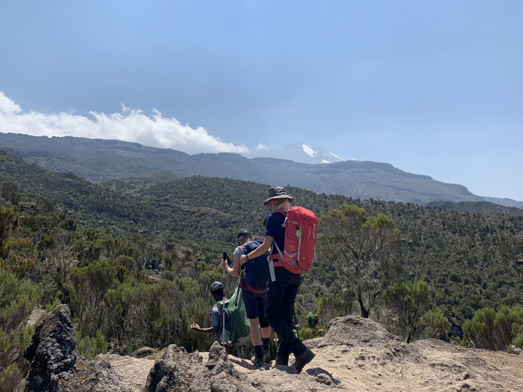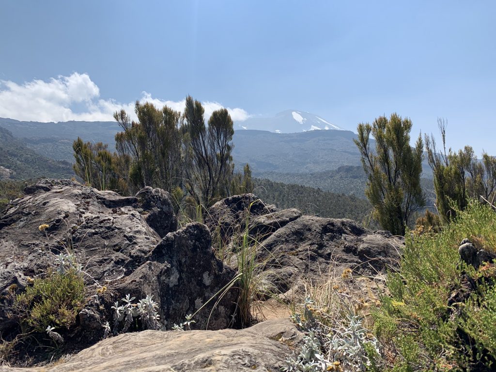 An einem großen Felsen machten wir schließlich Pause und wurden von unserem Guide Peter aufgefordert, auf ihn drauf zu klettern. Der Grund wurde recht schnell klar: Von dort aus hatten wir zum ersten Mal einen freien Blick auf den Kibo. Auch wenn man allgemein immer vom Kilimanjaro spricht, besteigt man eigentlich den Kibo, der die höchste Erhebung des Kilimanjaro-Massivs ist. Ein wunderschöner Anblick und ein unglaublicher Moment! Von nun an sollten wir das große Ziel immer im Blick haben.
