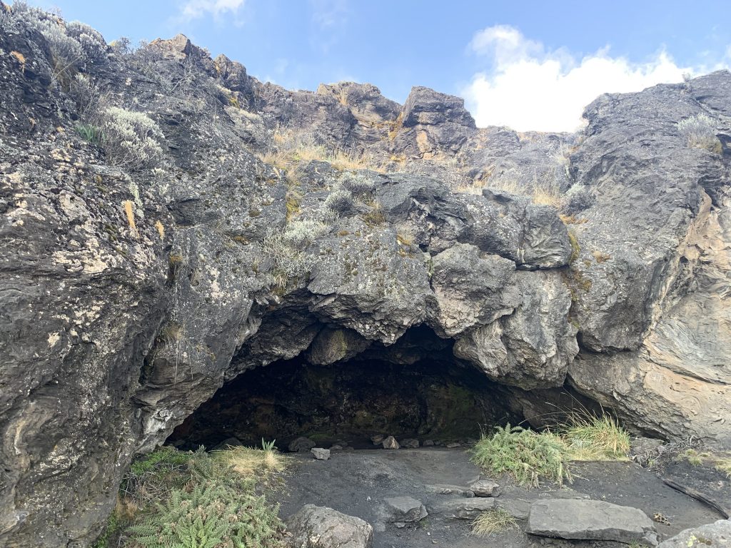 Nachdem wir uns ein wenig mit Popcorn gestärkt und kurz die Füße hochgelegt hatten, stand am Nachmittag noch ein kleiner Akklimatisierungs-Spaziergang zur Shira Cave auf dem Programm, der das Camp seinen Namen zu verdanken hat. Wie man am Namen bereits erahnen kann, handelt es sich bei der Shira Cave um eine in der Nähe des Camps gelegene Höhle, in der früher die Porter übernachtet haben. Dies kann man auch noch gut am Ruß an der Höhlendecke erkennen, der von den entzündeten Feuern für die Wärme stammt. Da die Höhle allerdings inzwischen einsturzgefährdet ist, haben die Behörden verboten, dass darin noch übernachtet wird. Von der Höhle aus stiegen wir noch ein wenig zu einem Aussichtspunkt auf, von dem man einen wunderschönen Blick auf das Shira-Plateau hat.