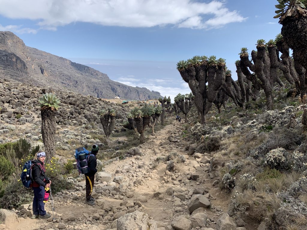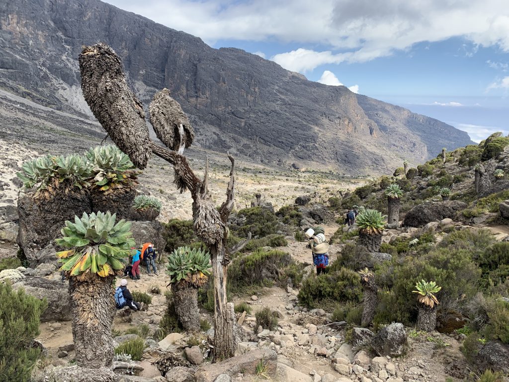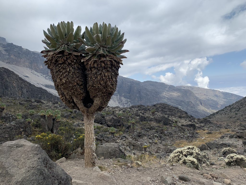 Nach der Stärkung ging es schließlich weiter in Richtung Barranco Camp. Dies ist zunächst ein wenig frustrierend, da man einen Großteil des Weges, den man am Vormittag zum Lava Tower aufgestiegen ist, nun wieder absteigt. Für die Akklimatisierung ist dies allerdings absolut ideal. Auf dem Weg ins Camp kommt man dann auch erstmals an den Riesen-Senezien vorbei, die links und rechts vom Weg stehen und nur hier wachsen. Wirklich beeindruckende und faszinierende Gewächse.