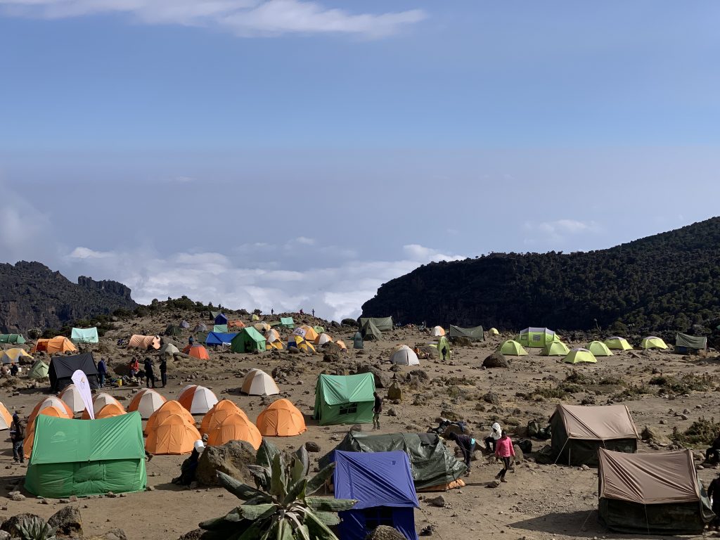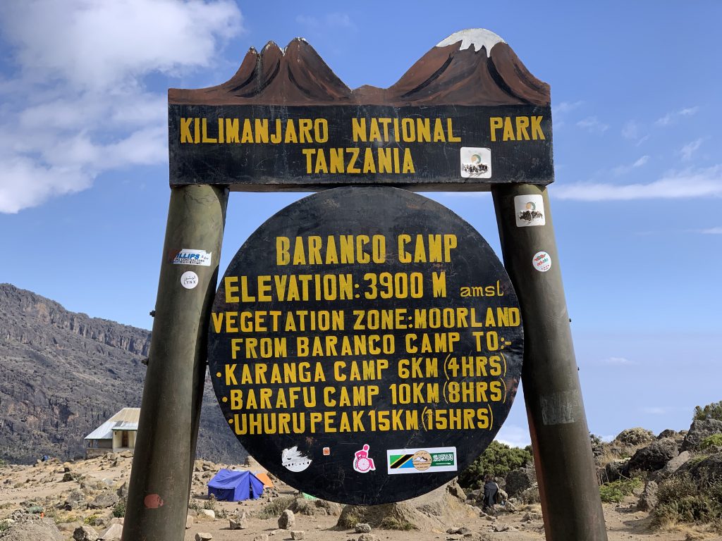 Ein Stück weiter erreicht man auch schon das Camp. In unserem Fall wurde auch der Himmel wieder blau, so dass wir uns unserer Extraschicht Kleidung, die wir am Lava Tower noch benötigt hatten, wieder entledigen konnten. Auch das Barranco Camp ist recht groß, vor allem deshalb, weil hier gleich mehrere Routen, nämlich die Lemosho-Route, die Umbwe-Route und unsere Machame-Route zusammentreffen. Der Name des Camps stammt übrigens von einer direkt dahinter liegenden Felswand, der Barranco Wall, die man am nächsten Tag erklimmen muss. Bereits jetzt war der Weg in der Wand schon gut zu erkennen und konnte einem schon gehörigen Respekt einflößen.