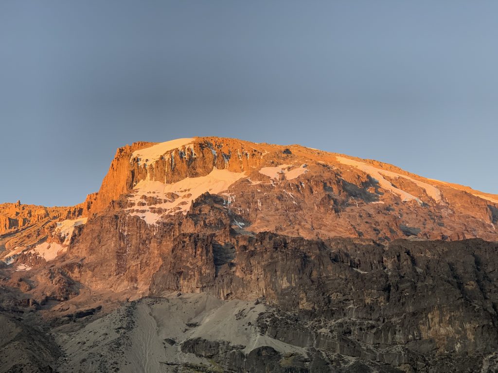 Wir verkrochen uns vor dem Abendessen noch kurz in unsere Zelte, um uns ein wenig auszuruhen. Zu diesem Zeitpunkt konnten wir noch nicht ahnen, dass uns noch echtes Highlight bevorstand. Als ich mich dann um halb sieben wieder aus dem Zelt schälte, um hinüber zum Essenszelt zu gehen, stand er auf einmal vor mir. Der Kibo mit seinen Gletschern, in leuchtendem Orange von der untergehenden Sonne. Was für eine Anblick! Zum Greifen nah und doch soweit weg. Auf jeden Fall aber ein Bild, das man nie wieder vergisst!