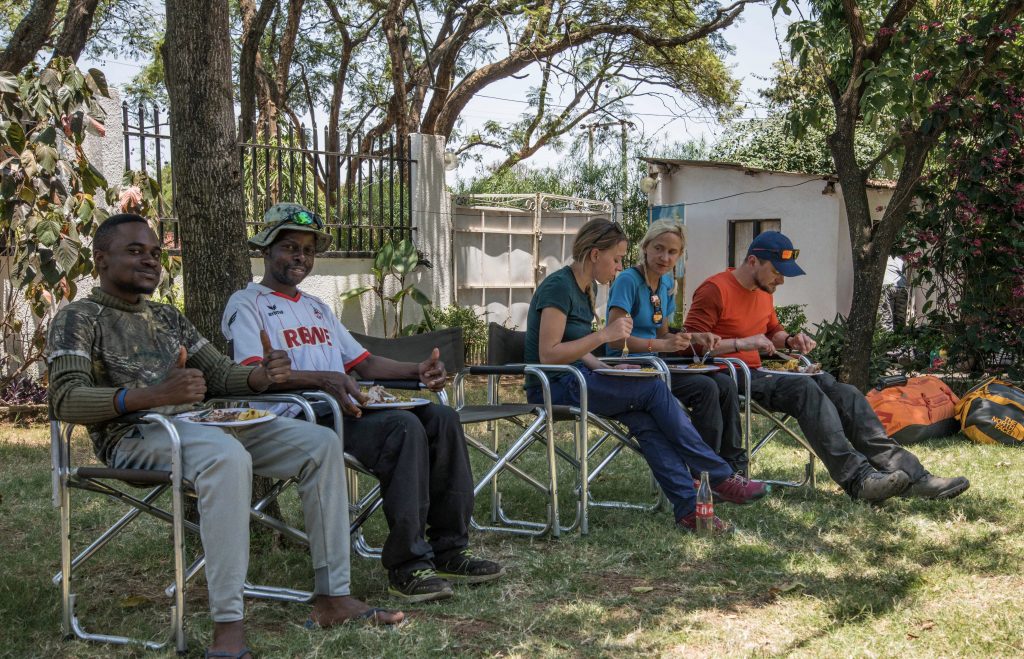 Ähnlich wie nach der Rückkehr vom Mount Meru zum Momella-Gate muss man leider auch hier sagen, dass die Situation für einen halbwegs weltoffenen Mitteleuropäer irgendwie unangenehm ist. Im Garten standen sechs Stühle, auf denen sich wir vier Touris, sowie mit Peter und Bariki unsere beiden Guides niederließen und aßen, während der Rest der Crew uns gegenüber auf einer 30 cm hohen Mauer hockte und uns mehr oder weniger dabei zusah. Da half es auch wenig, dass wir den Jungs die eine oder andere Runde Kaltgetränke spendierten, was allerdings sichtlich gut ankam. Auch für diese Tour hatten wir wieder das Trinkgeld für unsere Begleitmannschaft vorab eingesammelt und in einem Briefumschlag an Peter überreicht. Dieser teilte die Gesamtsumme nach einem für uns nicht ersichtlichen Schlüssel auf die einzelnen Crewmitglieder auf und drückte es ihnen während wir daneben saßen in die Hand. Wieder stellten sich uns dieselben Fragen wie schon am Mount Meru. War es in Ordnung? War es zu wenig? Wer hat wie viel bekommen? Und vor allem warum? Eine für uns alle irgendwie unangenehme Situation, zumal man immer wieder von Amerikanern hört, die im Überschwang des Glücks eines Gipfelerfolgs wohl mit dem Trinkgeld nur so um sich werfen. Wir hielten uns erneut an die Empfehlungen des DAV Summit Clubs und da das Team ja wusste, dass wir den Trip über diesen Anbieter gebucht hatten, dürften sie ungefähr gewusst haben, was auf sie zukommt. Es mag sein, dass wir es uns nur eingebildet haben, aber irgendwie lag nach der Trinkgeldzeremonie irgendwie eine merkwürdige Stimmung in der Luft.