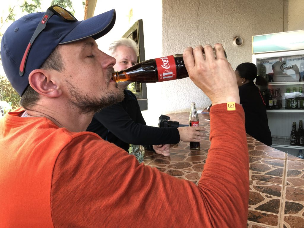 Genau dorthin ging es dann kurz darauf auch mit unserem Minibus. Bevor es allerdings so richtig losging, hielten wir auch schon wieder an, denn kurz hinter dem Mweka Gate gibt es noch einen großen Merchandising Store, wo wir natürlich nochmal anhielten, um uns das eine oder andere Andenken an unseren Trip zu kaufen. Obligatorisch sind dabei natürlich die allgegenwärtigen T-Shirts mit Aufschriften wie „Just did it!“ oder „Pole Pole“ oder einfach nur den verschiedenen Routen zum Gipfel des Kilimandscharo. Nachdem wir uns entsprechend eingedeckt hatten, ging es dann aber wirklich auf den Heimweg, der uns an riesigen Kaffeeplantagen (offenbar vom deutschen Großröster Tchibo) und an den Bergdörfern der Chagga vorbei nach Moshi und dort in den Garten unserer Agentur KAT führte. Hier sollte es noch eine kleine Abschlusszeremonie inklusive der feierlichen Übergabe unserer Urkunden geben. Doch bevor es soweit war, gönnten wir uns etwas, was vermutlich noch nie in meinem Leben so lecker geschmeckt hat: Eine eiskalte Coca-Cola – und dann auch noch aus einer Glasflasche. Unglaublich, was so eine braune, extrem zuckerhaltige Brause für Glückshormone in einem freisetzen kann. Anschließend gab es noch ein letztes leckeres Mittagessen von unserem Koch Thomas, welches wir auf Stühlen im Garten einnahmen.